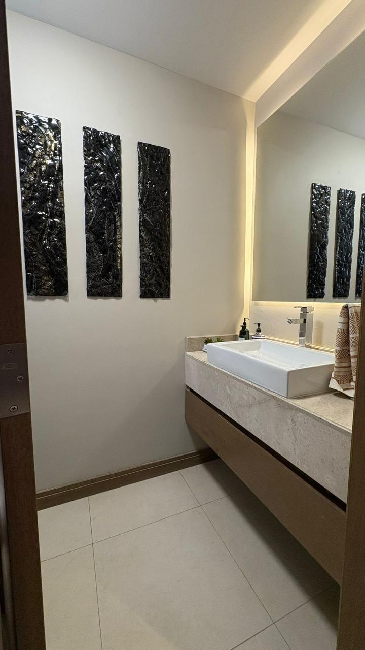 2 Baños completos en el piso de arriba y un medio baño con muebles fabricados en madera para guardar cosas.