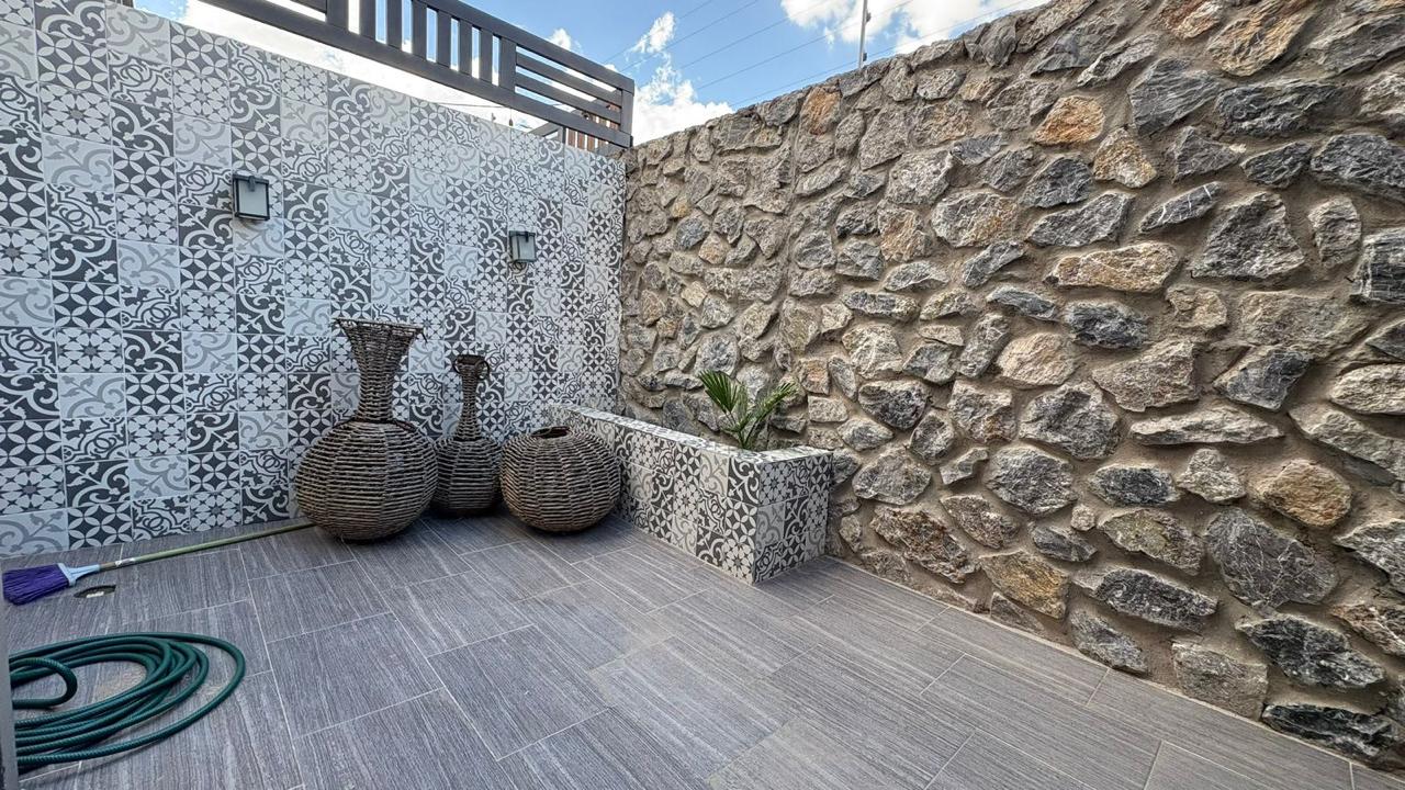 Terraza von piso cerámico y paredes con cerámica decorativa y piedra. Maceta exterior forrada también de cerámica decorativa.