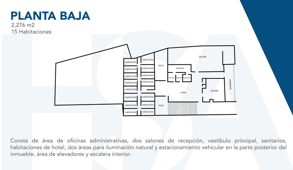 Consta de área de oficinas administrativas, dos salones de recepción, vestíbulo principal, sanitarios, habitaciones de hotel, dos áreas para iluminación natural y estacionamiento vehicular en la parte posterior del inmueble, área de elevadores y escalera interior.