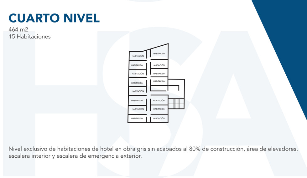 Área exclusiva de habitaciones de hotel, divididas en zonas: primero la construcción original del hotel y segundo en obra gris sin acabados al 80% de construcción, área de elevadores, escalera interior y escalera de emergencia exterior