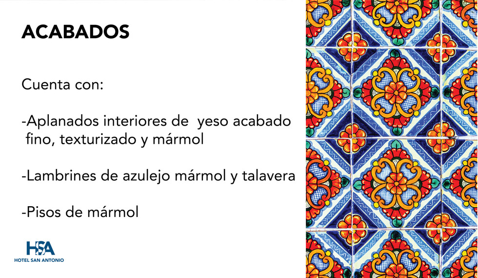 ACABADOS Cuenta con: -Aplanados interiores de yeso acabado fino, texturizado y mármol -Lambrines de azulejo mármol y talavera -Pisos de mármol