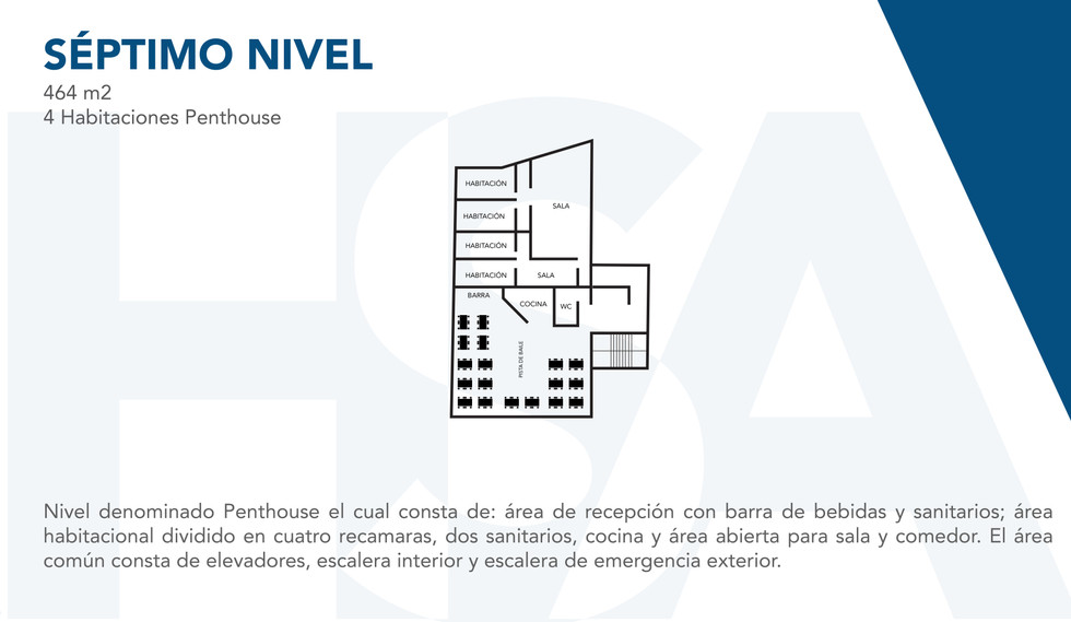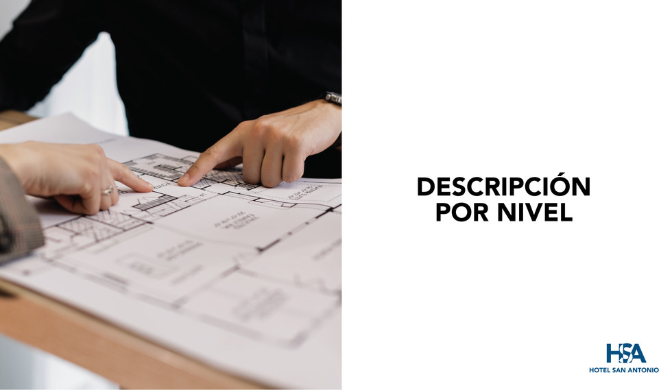 Nivel dividido en dos áreas de acuerdo a su uso: un salón de recepciones con espacio para cocina, sanitarios interiores y exteriores, mesas y terraza exterior; y segundo un área exclusiva para habitaciones de hotel en obra gris sin acabados al 80% de construcción, área de elevadores, escalera interior y escalera de emergencia exterior